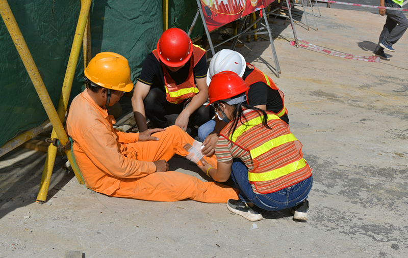 現(xiàn)場模擬一名工人在2#、3#廠房間的廊架上進行施工作業(yè)時,因未系安全帶、腳下未踩穩(wěn)造成高處墜落受傷,其他人員對其進行急救的情況。從發(fā)現(xiàn)人員墜落受傷、疏散人群、封鎖現(xiàn)場到對受傷人員骨折部位用夾板進行固定再送至醫(yī)院,僅歷時10分鐘。整個過程緊張有序,應(yīng)急處理得當(dāng)。演練中,現(xiàn)場每名救援人員嚴(yán)肅認(rèn)真對待每個演練細(xì)節(jié)。各應(yīng)急小組聞聲而動,各司其職,反應(yīng)迅速,各環(huán)節(jié)無縫銜接,使救援任務(wù)得以順利完成。