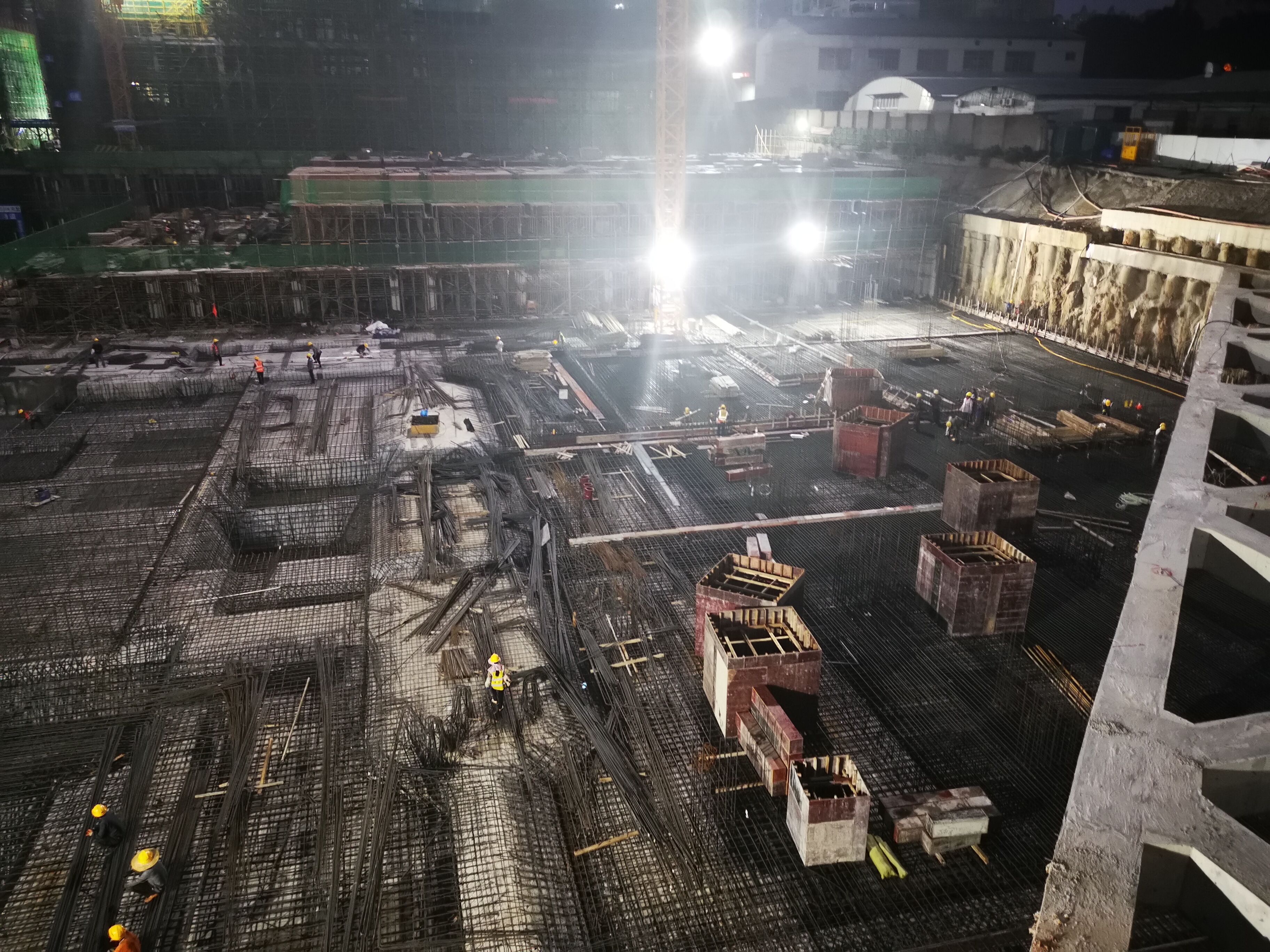 2021年2月底收到支護樁和水平混凝土支撐梁施工圖紙后,項目推進小組立即組織項目部結(jié)合雨季施工特點制定科學(xué)合理的搶工方案,倒排工作計劃、細化實施方案、強化責(zé)任落實,能早則早、能快則快。因項目處于鬧市,搶工首要解決的就是施工擾民問題。在推進小組組長、嘉通公司副總經(jīng)理何小勇帶領(lǐng)下,相關(guān)組員主動加強與建設(shè)行政主管部門和環(huán)保部門溝通,說明、強調(diào)項目搶險的必要性,盡快征得了相關(guān)部門的許可,部分施工內(nèi)容順利得以24小時連續(xù)施工。分管該項目的嘉通公司工程一部副經(jīng)理秦桂暢積極發(fā)揮自己的溝通協(xié)調(diào)能力,幫助施工單位主動與社區(qū)、周邊居民溝通,取得各方理解,以保障搶工計劃順利開展。項目業(yè)主代表趙政生根據(jù)現(xiàn)場施工實際情況,組織各方會議及時溝通調(diào)整,合理安排施工工序,盡可能將產(chǎn)生噪音的工作安排在白天進行。同時,搶工階段正值南寧的雨季,推進小組加強雨季施工組織,協(xié)調(diào)施工單位在雨天安排受雨水影響較小的工作,項目現(xiàn)場形成了“大雨小干,小雨大干,不下雨拼命干”的局面。尤其是在土方外運期間,要求施工單位協(xié)調(diào)各方關(guān)系,調(diào)配工料機的關(guān)系,天晴做到“人停機不停”的搶工狀態(tài)。各項措施保證了項目在兩個月的時間里基本保持在24小時搶工狀態(tài),通過推進小組及參建單位夜以繼日的努力,2021年4月20日項目西北角新增72根支護樁、水平混凝土支撐梁以及50000m3土方外運工作得以完成。