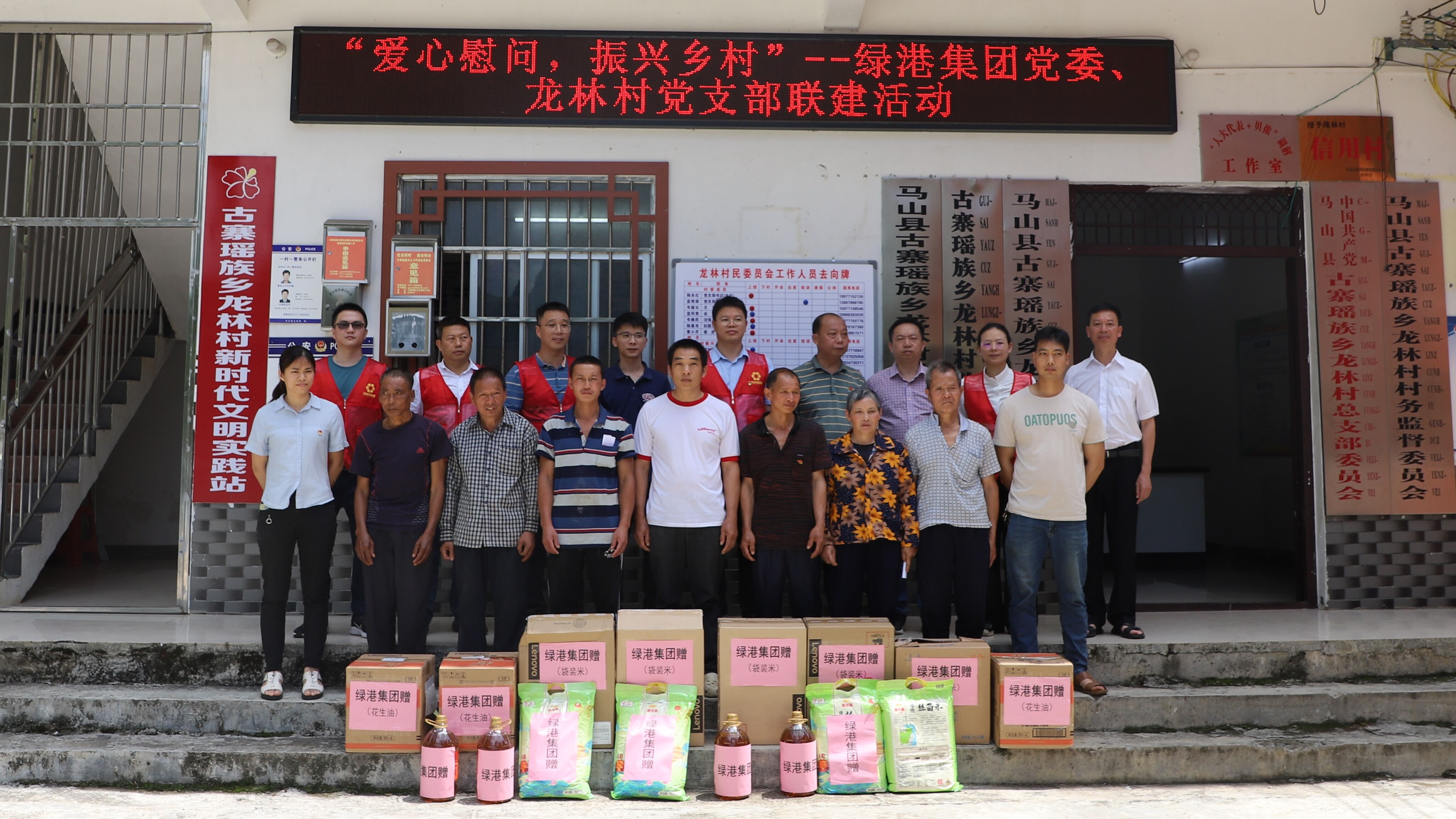 5月29日,綠港集團黨委副書記、總經(jīng)理鄧?yán)^慧,黨委委員、副總經(jīng)理陸羿冰,黨委委員、副總經(jīng)理陽正輝,以及集團黨委辦和萬方公司黨支部的部分同志代表集團黨委,到對口幫扶的馬山縣古寨瑤族鄉(xiāng)龍林村開展村企聯(lián)建慰問活動。綠港集團派駐龍林村第一書記梁華以及龍林村干部、駐村工作隊員一起參加了活動。
