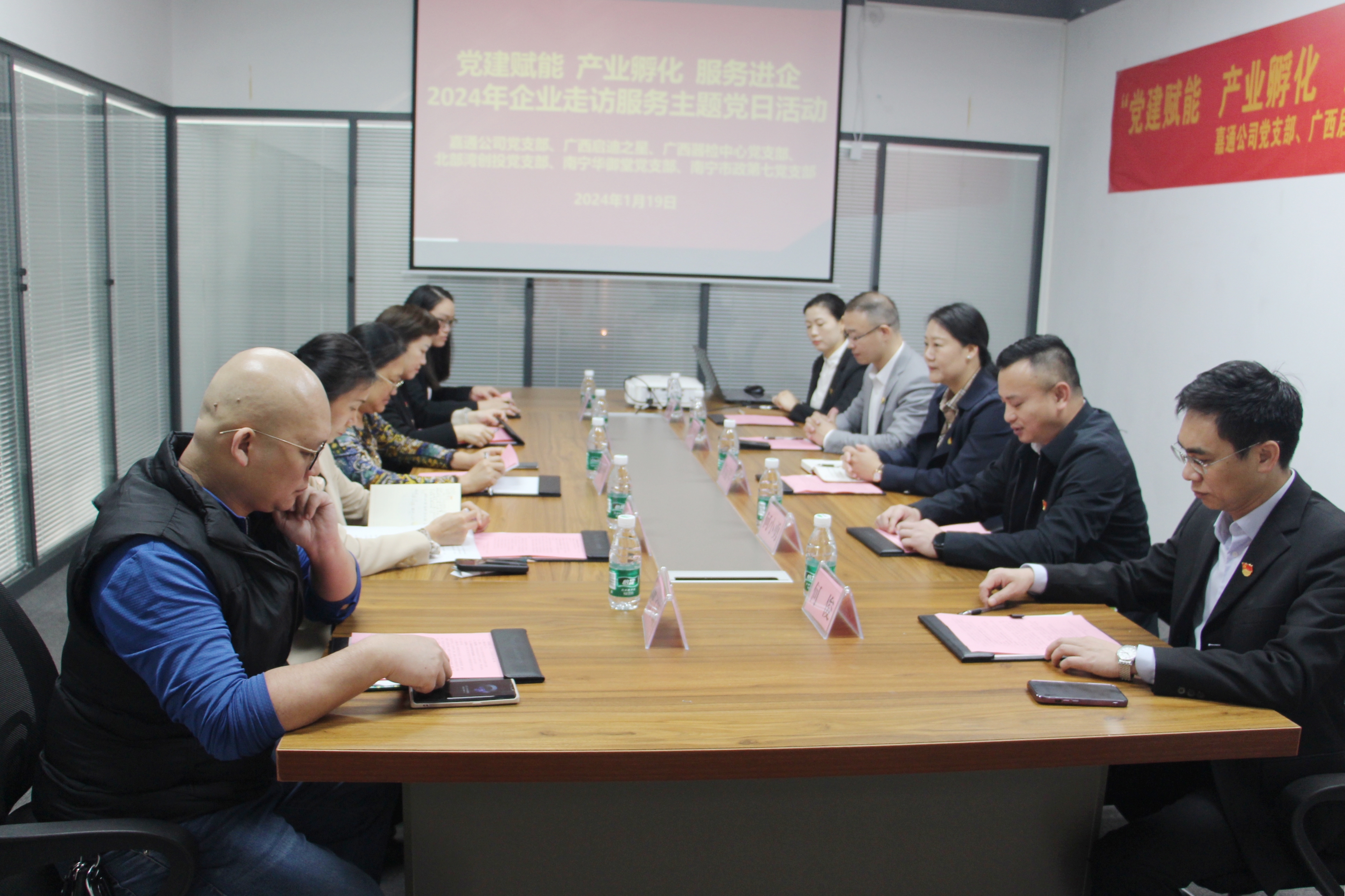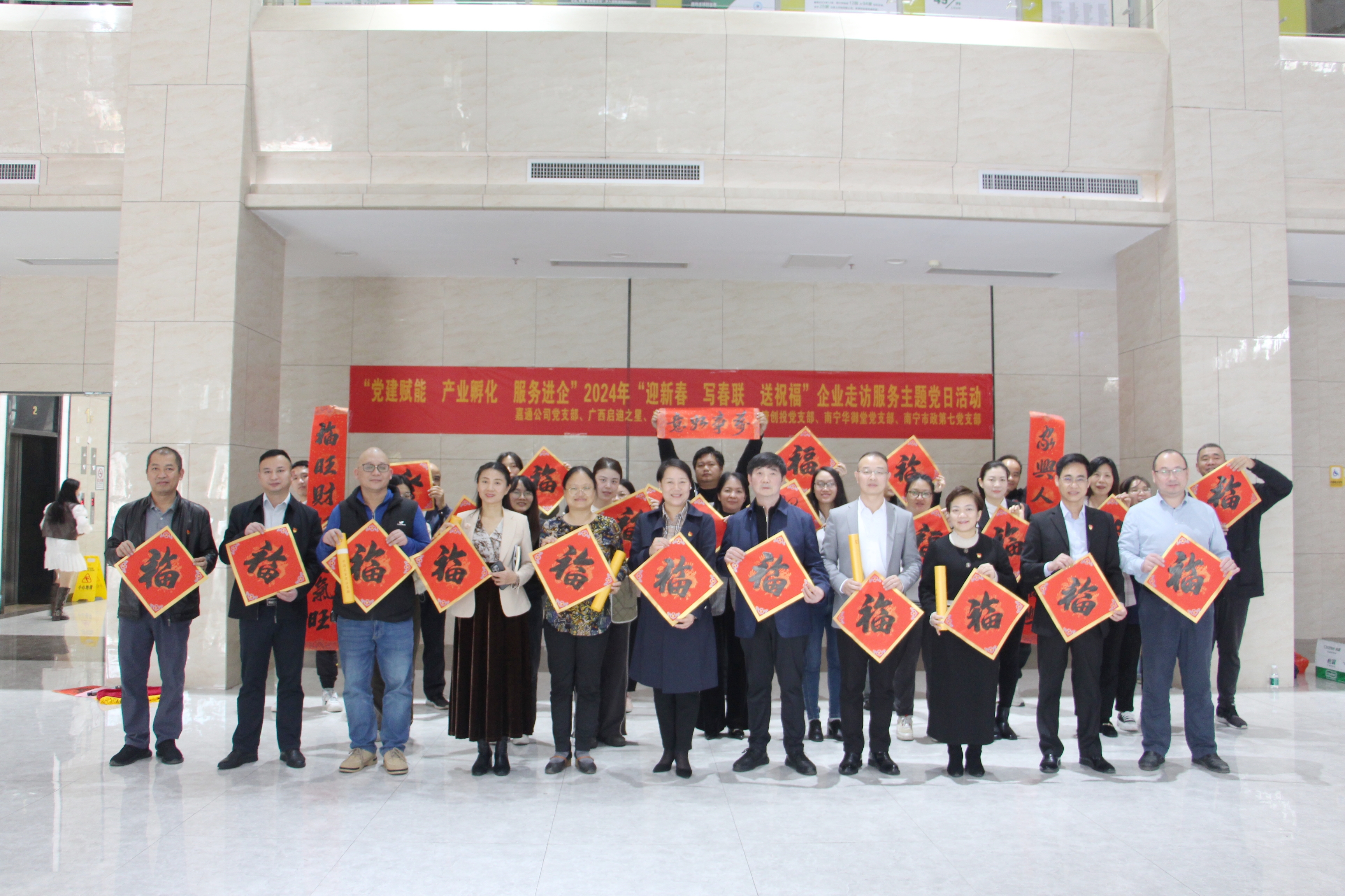 為深化黨建與業(yè)務(wù)融合,通過(guò)黨建引領(lǐng)提升企業(yè)服務(wù)質(zhì)量,發(fā)揮好產(chǎn)業(yè)經(jīng)濟(jì)穩(wěn)定器功能,以做強(qiáng)“鏈上黨建”推動(dòng)產(chǎn)業(yè)高質(zhì)量發(fā)展,1月19日,嘉通公司黨支部深入金凱工業(yè)園聯(lián)合廣西啟迪之星公司、廣西器檢中心黨支部、北部灣創(chuàng)投黨支部、南寧華御堂黨支部、南寧市政第七黨支部開展“黨建賦能 產(chǎn)業(yè)孵化 服務(wù)進(jìn)企”2024年“迎新春 寫春聯(lián) 送祝?!逼髽I(yè)走訪服務(wù)主題黨日活動(dòng),嘉通公司黨支部黨員代表及職工代表參加本次活動(dòng)。