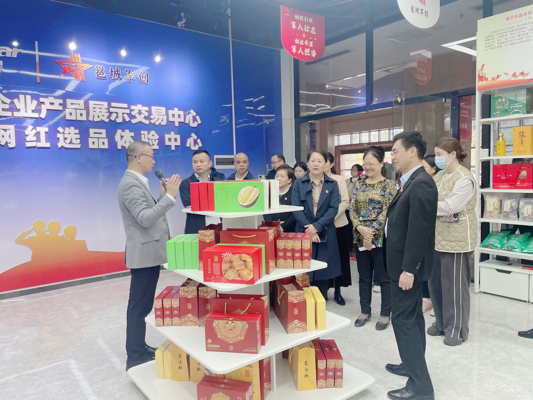 隨后,全體人員共同參觀了綠港金凱未來(lái)產(chǎn)業(yè)創(chuàng)新中心,黨建基地、企業(yè)文化建設(shè)長(zhǎng)廊、軍創(chuàng)會(huì)客廳、直播電商網(wǎng)紅選品體驗(yàn)中心,了解了孵化環(huán)境、孵化成果、基地幫扶等情況,并圍繞企業(yè)生產(chǎn)情況、產(chǎn)業(yè)定位及發(fā)展前景等方面進(jìn)行座談分享。